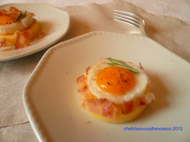 Con un taglia pasta del diamentro di 5 cm ritagliate dei dischetti di polenta gialla già pronta che metterete a scaldare nel forno ad una temperatura di 180°. Intanto scaldate una pentola antiaderente con pochissimo olio, prendete un altro coppapasta della diametro di 4 cm imburrato e ponetelo al centro della pentola e sgusciatevi all'interno un uovo di quaglia, cuocete per circa due minuti fino a quando il'albune non si sara cotto. In un altra padella bassa rosolate le fette di bacon. Sfornate la polenta, appoggiate un uovo su ogni dischetto salate e pepate e decorate con pezzettini di pancetta